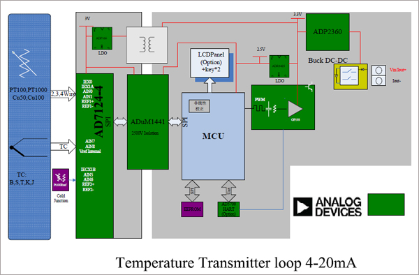 今天推薦給每個(gè)人的“智能溫度變送器參考設(shè)計(jì)”具有高精度、信號(hào)隔離、液晶顯示、HART協(xié)議支持、環(huán)路電源、接口保護(hù)等特點(diǎn)。該平臺(tái)主要基于ADI公司的具有自校準(zhǔn)功能的多通道模數(shù)轉(zhuǎn)換器和愛(ài)普生公司的超低功耗16位單片機(jī)。
